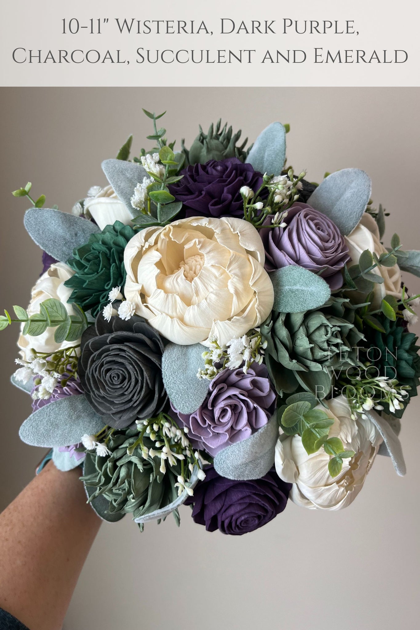 This bouquet features wood flowers in wisteria, dark purple, charcoal, light gray, silver, and their natural color of ivory. Flowers are handmade, which means each is unique in shape and size. Each also has variations from the wood grain and may include small flecks of bark. Flowers have beautiful and unique imperfections, as real flowers do, giving your bouquet an elegant rustic look. The greenery includes faux lambs ear, baby's breath, eucalyptus, and gypsophila. As each flower is unique in shape and size, the flower arrangement in each bouquet will be unique, however it will be the same flowers and design as pictured.