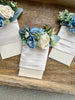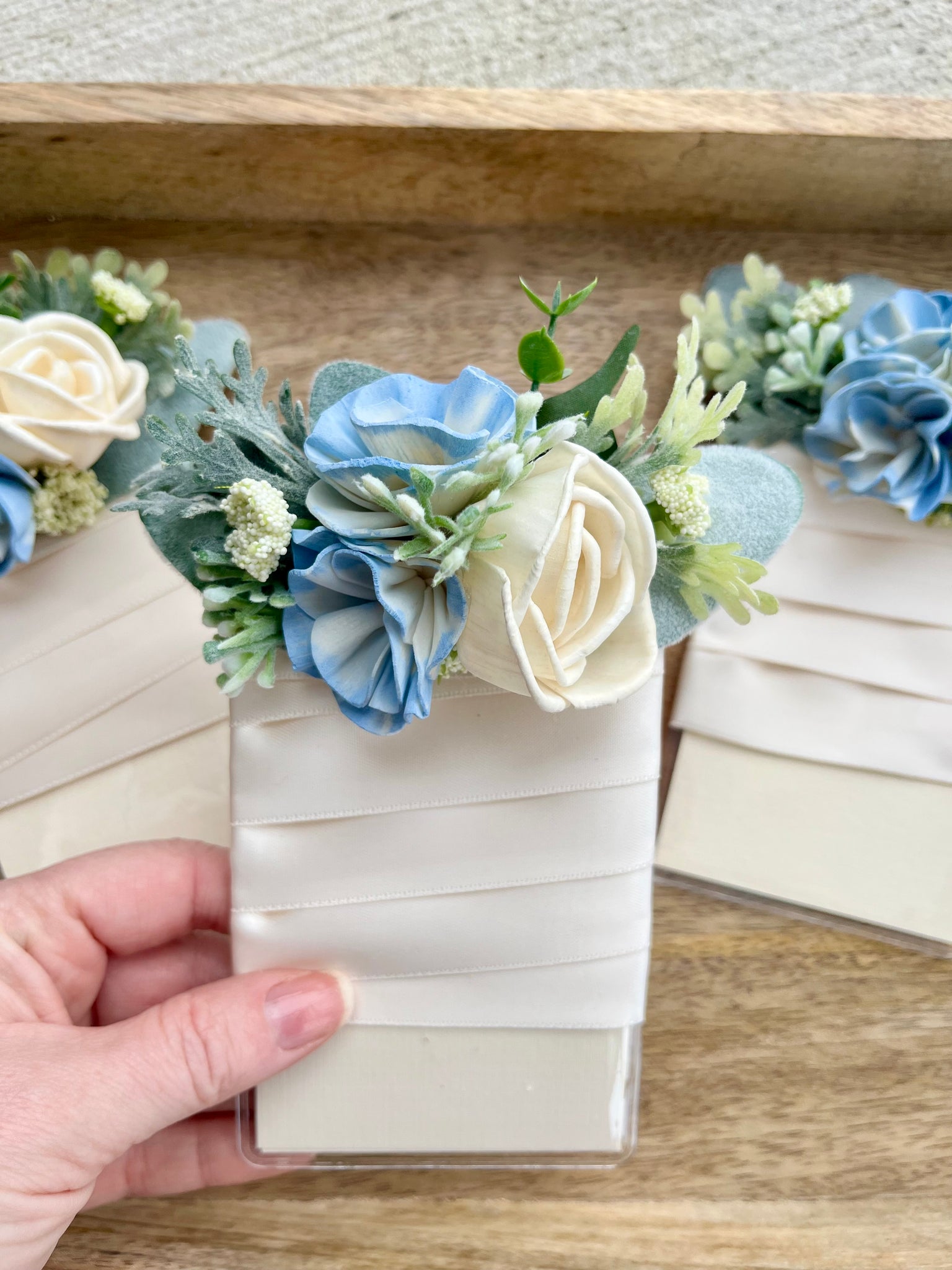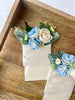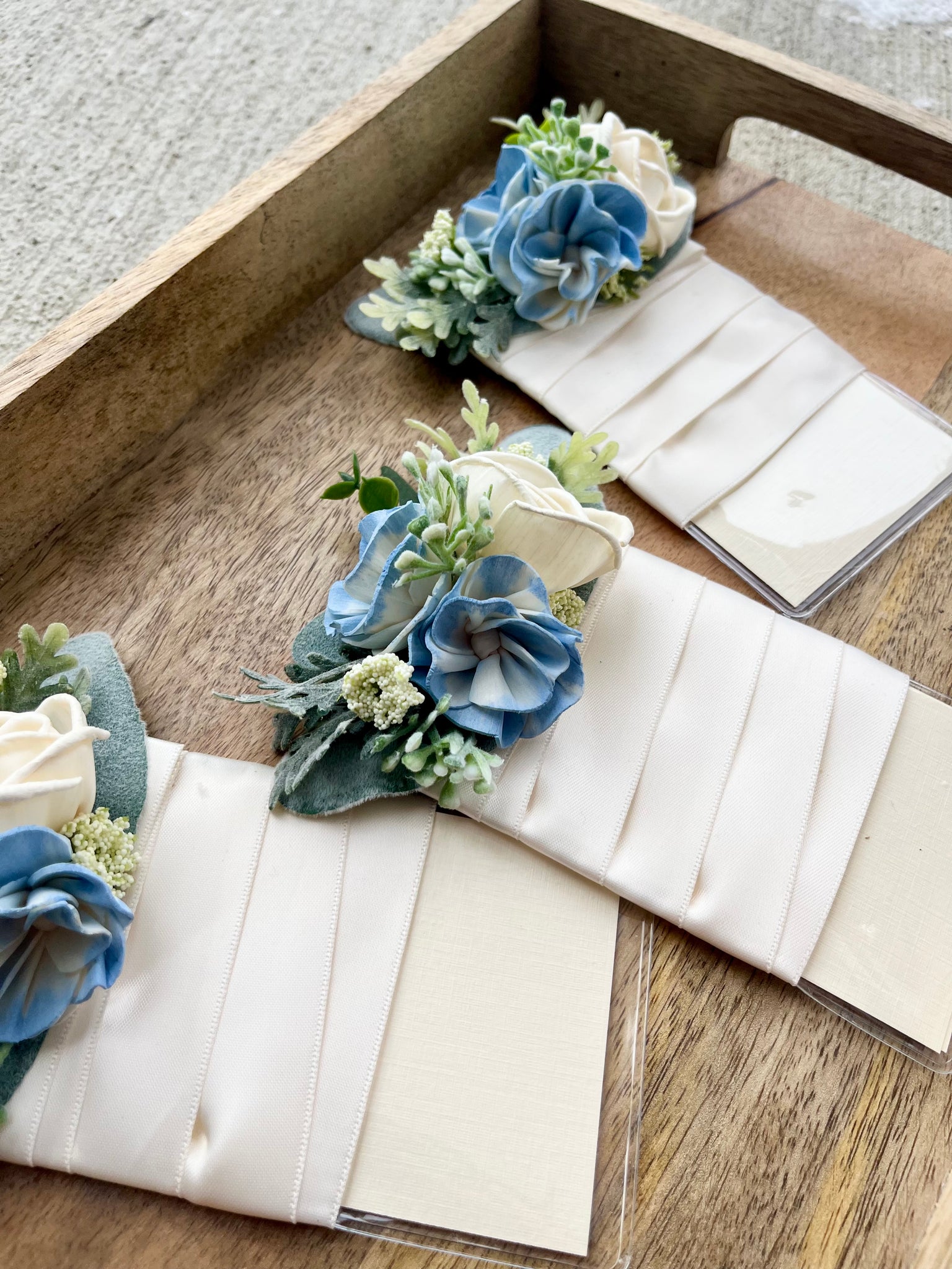 These boutonnieres feature an ivory rose and hydrangea blossoms in sky blue. Flowers are handmade, and each has unique coloring from the wood grain. Flowers have beautiful and unique imperfections, as real flowers do, giving your bouquet an elegant rustic look. The greenery includes faux lamb's ear, eucalyptus, queen anne's lace, and dusty miller.