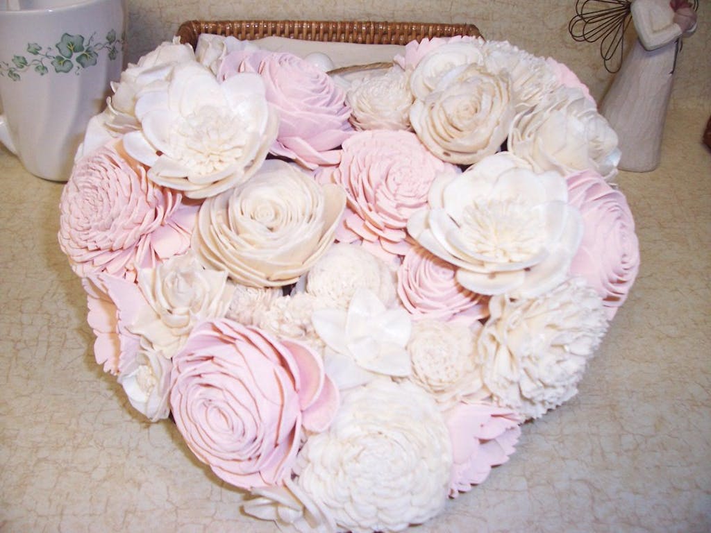 This beautiful wall hanging will compliment any room in your house! This piece is made of wood flowers arranged in the shape of a heart and hangs on twine. Each flower is unique in shape and size. Each heart is made to order. Placement and sizes of flowers will vary, but the types of flowers and style will be similar, making your piece unique. (See photos above for examples.)