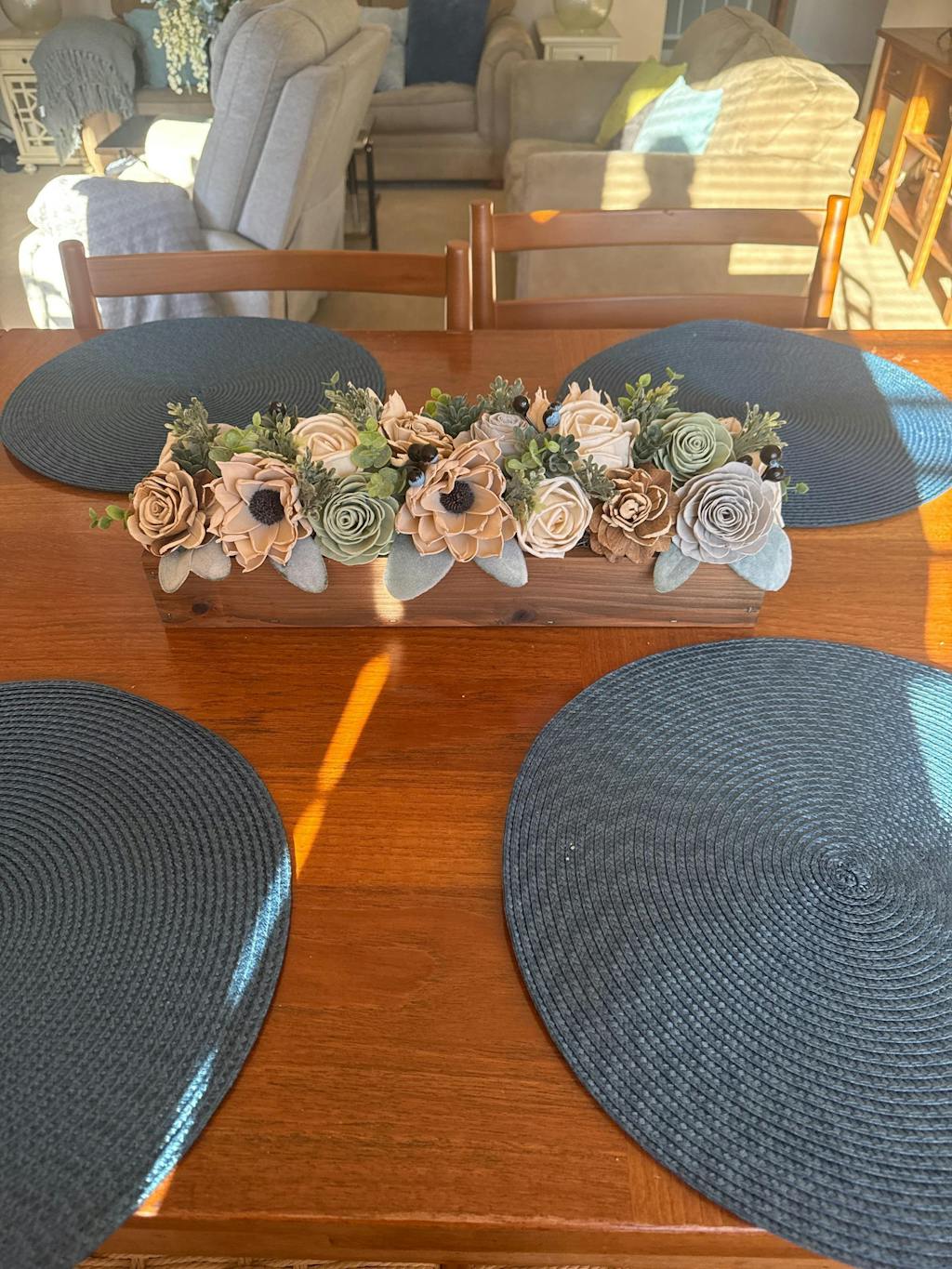 This rustic centerpiece can compliment any room in your house! This piece is made of wood flowers in their natural colors of ivory and bark along with and artificial greenery including boxwood, dusty miller, eucalyptus, and blue berries in a rustic dark brown wood box. Each flower is unique in shape and size. Each piece is made to order. Flower placement will vary but the same types of flowers will be used.