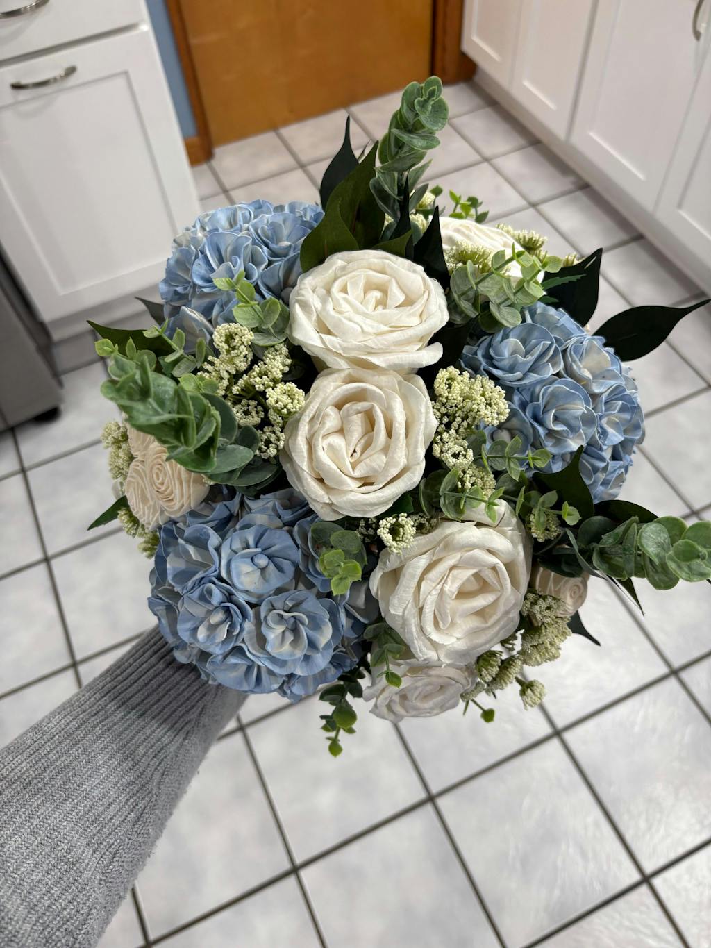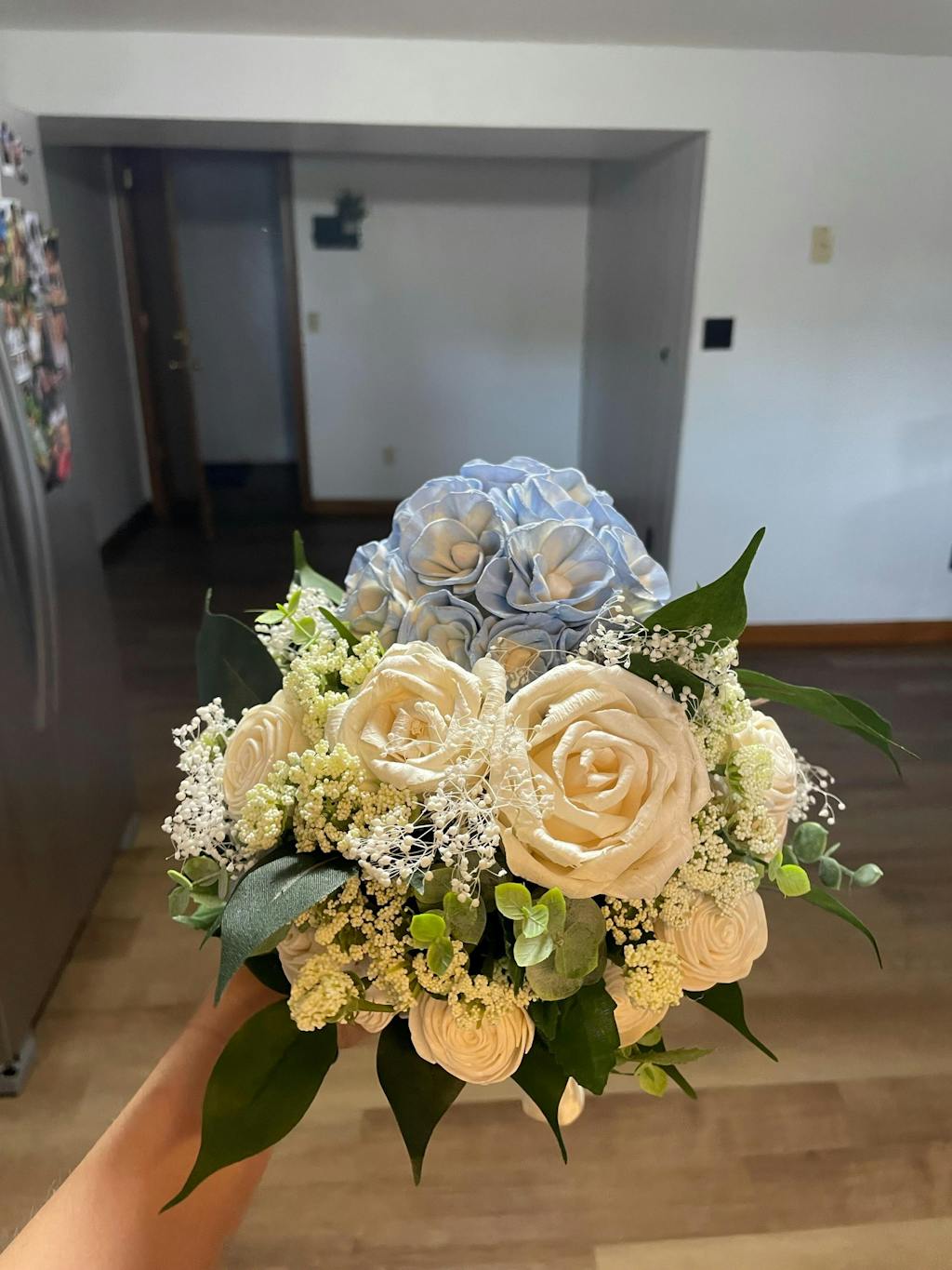 This bouquet features wood flowers in their natural ivory color as well as in light blush, dusty rose and champagne. The bouquet accents include faux lambs ear, faux dusty miller, and preserved baby's breath. Flowers are handmade, which means each is unique in shape and size. Each also has variations from the wood grain and may include small flecks of bark. Flowers have beautiful and unique imperfections, as real flowers do, giving your bouquet an elegant rustic look.