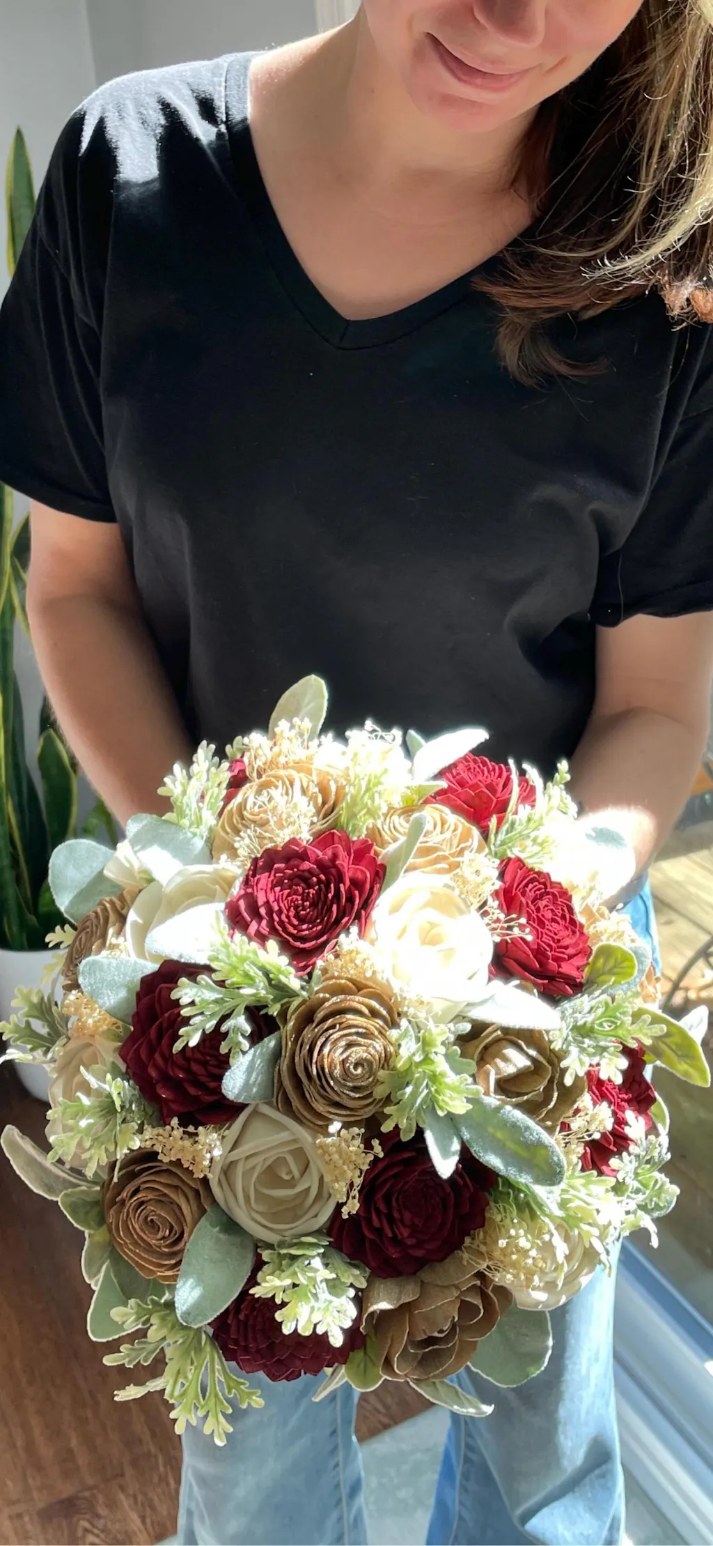 This bouquet features wood flowers in their natural ivory color as well as in light blush, dusty rose and champagne. The bouquet accents include faux lambs ear, faux dusty miller, and preserved baby's breath. Flowers are handmade, which means each is unique in shape and size. Each also has variations from the wood grain and may include small flecks of bark. Flowers have beautiful and unique imperfections, as real flowers do, giving your bouquet an elegant rustic look.