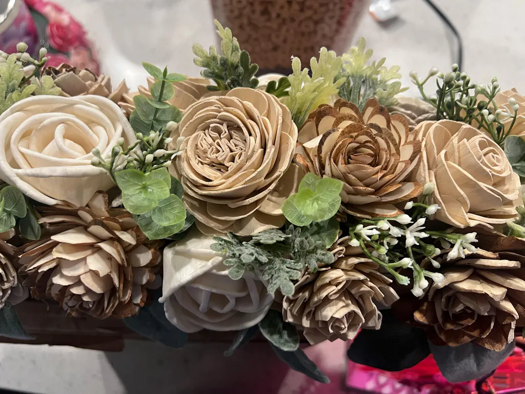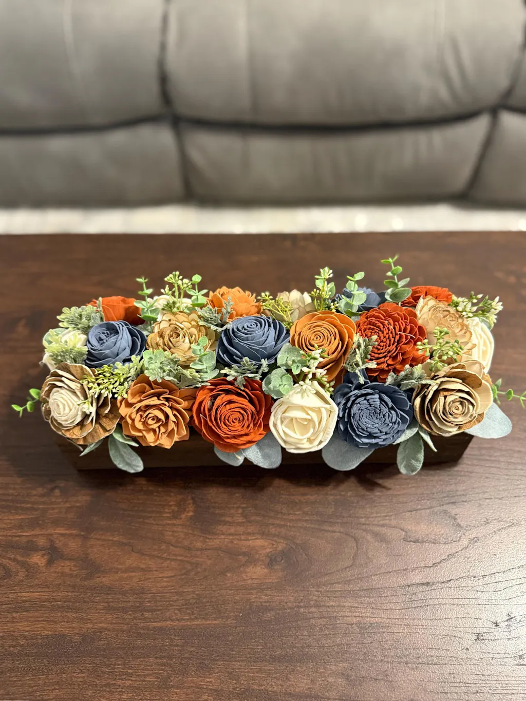 This rustic centerpiece can compliment any room in your house! This piece is made of wood flowers in their natural colors of ivory and bark along with and artificial greenery including lamb's ear, dusty miller, and baby's breath in a rustic dark brown wood box. Each flower is unique in shape and size. Each piece is made to order. Flower types and placement will vary but the same look and mix of flowers shown here will be used.