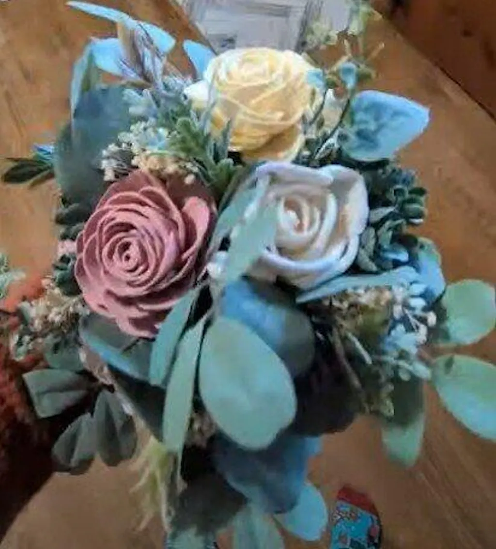 Flowers are handmade, which means each is unique in shape and size. Each also has variations from the wood grain and may include small flecks of bark. Flowers have beautiful and unique imperfections, as real flowers do, giving your bouquet an elegant rustic look. As each flower is unique in shape and size, the flower arrangement in each bouquet will be unique, however it will be the same flowers and design as pictured. All sizes listed are the diameter of the bouquet.