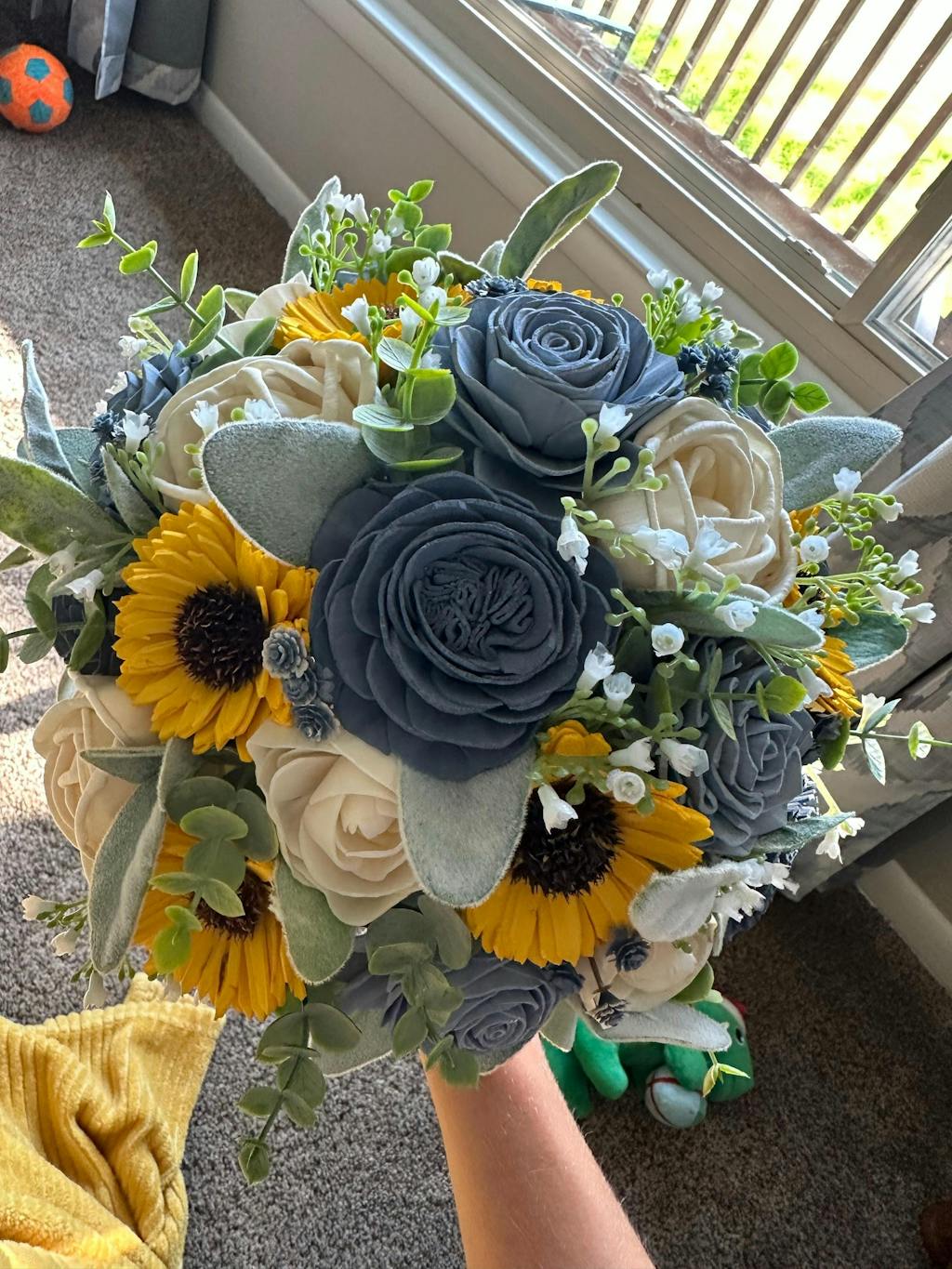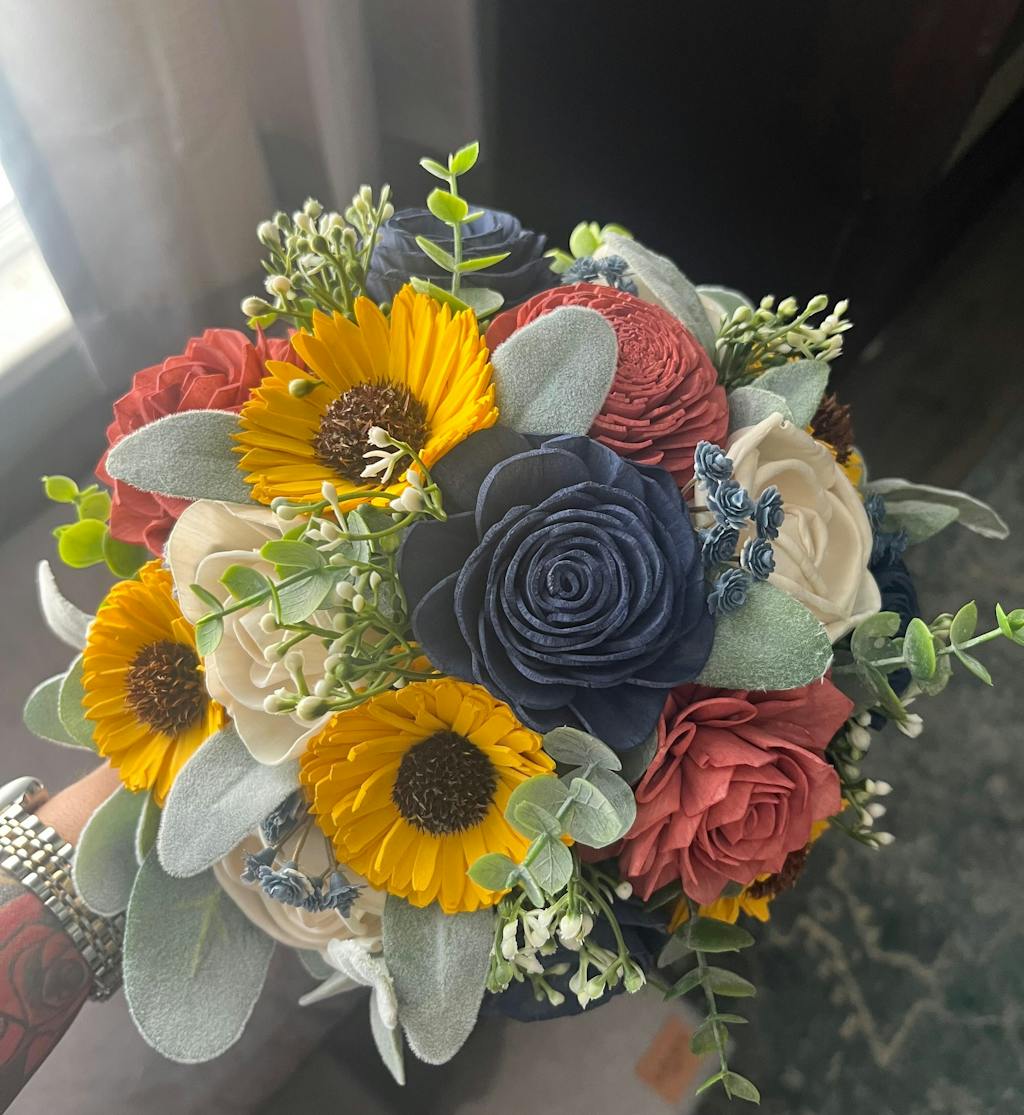 This bouquet features wood flowers in sunflower yellow, dusty blue, slate blue, and their natural color of ivory. Flowers are handmade, which means each is unique in shape and size. Each also has variations from the wood grain and may include small flecks of bark. Flowers have beautiful and unique imperfections, as real flowers do, giving your bouquet an elegant rustic look. The greenery includes faux lambs ear, baby's breath, eucalyptus, willow and blue gypsophila (or another coordinating color if you choose custom colors.) As each flower is unique in shape and size, the flower arrangement in each bouquet will be unique, however it will be the same flowers and design as pictured.